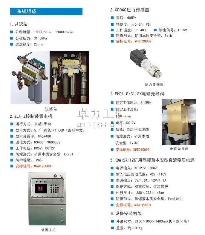 裝置主要由:設備安裝機架、控制裝置主機、隔爆兼本安型直流電源、主閥體、進出液壓力傳感器、進出液壓力表、電磁先導換向閥、濾筒與濾芯組件、下排污組件、輸液管路組成。