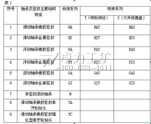鉆頭系列代號:對于三牙輪鉆頭,按其軸承及密封結(jié)構(gòu)主要特征,分為9個標(biāo)準(zhǔn)系列。除軸承和密封外,鉆產(chǎn)學(xué)研結(jié)構(gòu)上比較大的改進(jìn)作為特殊結(jié)構(gòu),標(biāo)準(zhǔn)系列與特殊結(jié)構(gòu)或特殊結(jié)構(gòu)的組合組成特殊系列。對于單牙輪鉆頭,鉆頭系列代號以“Y×”表示,“Y”指一個牙輪,“×”為設(shè)計編號,代表不同鉆頭設(shè)計特征,江漢鉆頭系列代號見下表1.