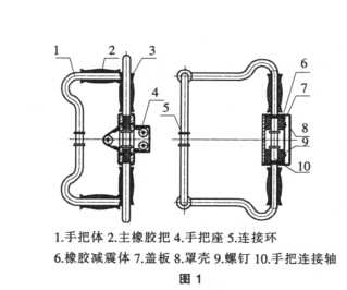 下面對圖 1 的結構和功能進行說明。手 把座 4, 作為連接件與機器柄體連接; 手把體 1, 由鋼管彎成后與連接環 5 和手把軸 10 焊 接在一起; 主橡膠把 2、輔橡膠把 3 及橡膠減 震體 6 通過包膠包在手把體 1 上。主橡膠把 2 是操作者使用機器時的主要握持地方。輔 橡膠把 3 用于機器工作前、后握持的地方。橡 膠減震體 6 與手把體 1 由蓋板 7 經螺釘 9 固 定于手把座內, 橡膠減震體 6 作為橡膠彈簧 起減震作用, 與主橡膠把 2、輔橡膠把 3 起著 雙重減震作用。罩殼 8 罩在手把座外, 它與手 把座 1 一起連接在主機的柄體上, 它主要起 美觀和裝飾作用。