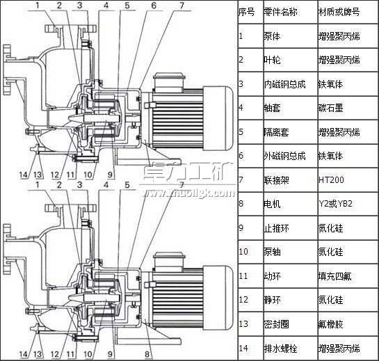 5、塑料自吸磁力泵長時間運行后,發(fā)現(xiàn)泵有異常情況(噪音大,震動加劇),應拆檢軸承和端面動環(huán)的磨損情況,若軸承和泵軸的間隙、葉輪軸向竄動較大時,應更換軸承和軸向動環(huán)。