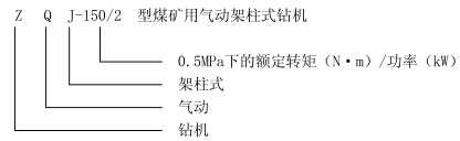 型號示例:ZQJ-150/2 型煤礦用氣動(dòng)架柱式鉆機(jī):Z 表示鉆機(jī);Q 表示氣動(dòng)驅(qū)動(dòng)回轉(zhuǎn)器;J 表示架柱式;150/2 表示在 0.5MPa 氣壓下的額定轉(zhuǎn)矩為 150N·m,此時(shí)回轉(zhuǎn)器功率為 2kW。